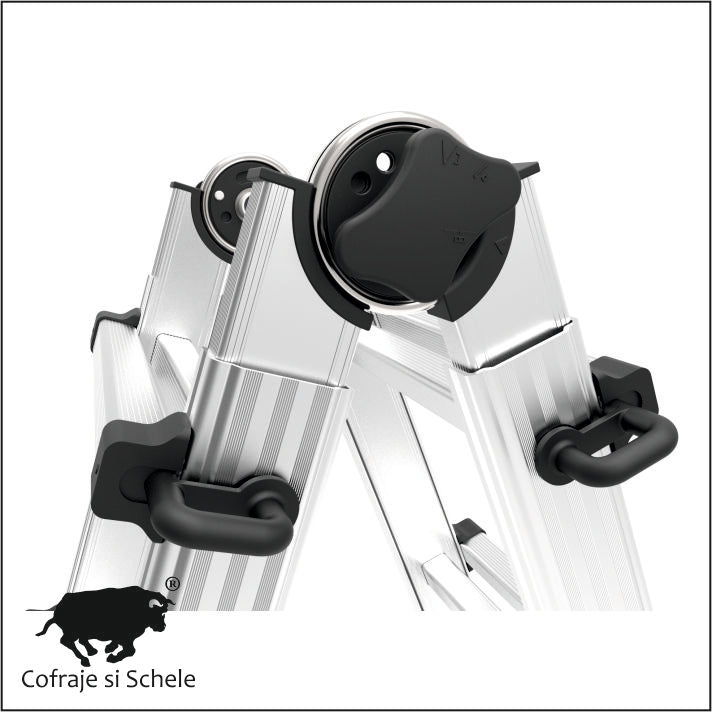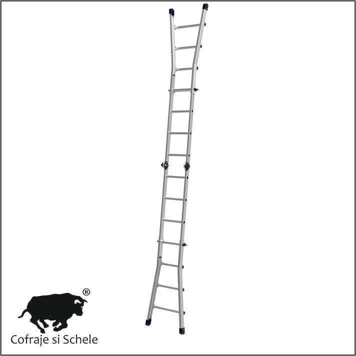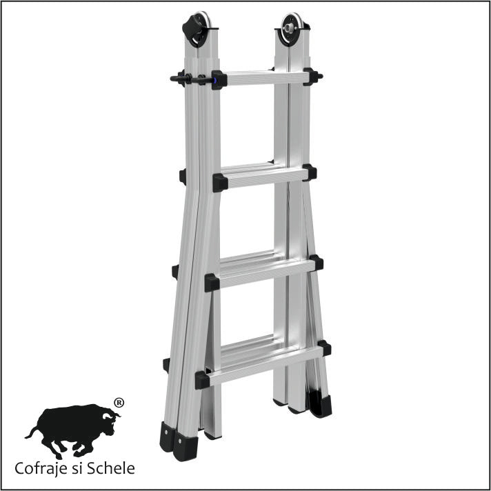 Scara telescopica din aluminiu, utilizabila ca si capra de lucru (sevalet), reglata in 2 elemente si deschisa. Trepte de 28x28mm. Pasul intre trepte 280mm.